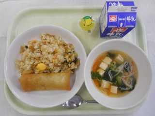 【牛乳・海鮮チャーハン・手作り春巻き・チンゲンサイと豆腐のスープ・ひとくちレモンゼリー】