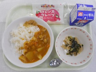 【牛乳・チキンカレーライス・わかめサラダ・お祝いクレープ】