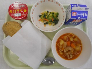 【牛乳・きなこ揚げパン・ミネストローネ・グリーンサラダ・ヨーグルト】