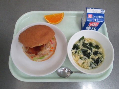 牛乳 丸パン 和風ハンバーグ コールスローサラダ わかめと卵のスープ オレンジ