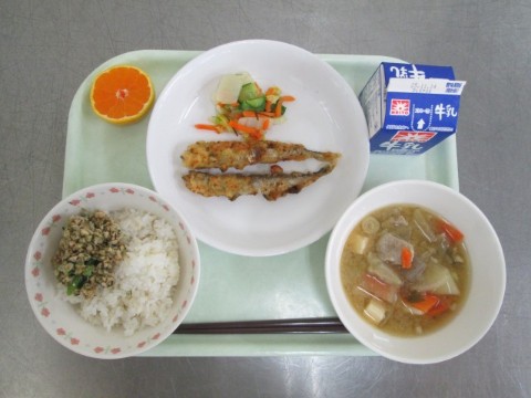 牛乳 麦ご飯 ししゃもの彩り揚げ 白菜の柚香漬け 豚汁 みかん