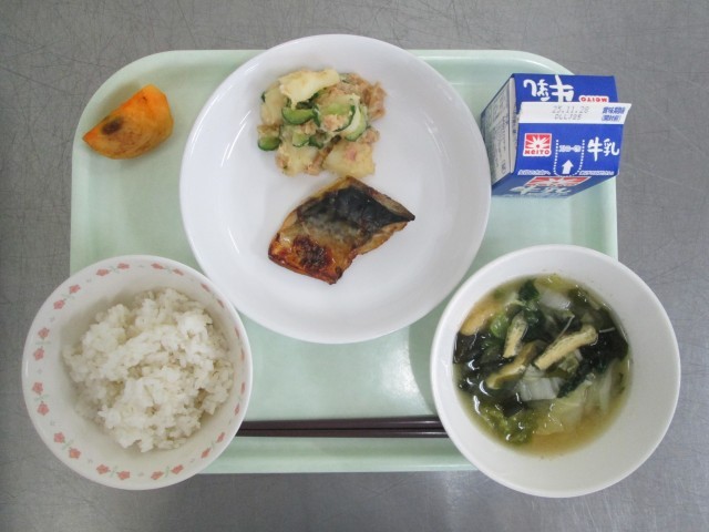 牛乳 麦ご飯 鯖の豆板醬焼き じゃが芋の和風サラダ 白菜の味噌汁 柿