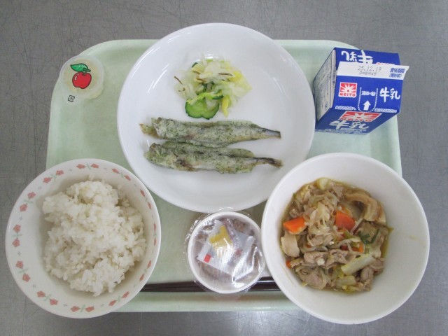 牛乳 麦ご飯 ししゃもの磯辺焼き 納豆 白菜と大根の柚香漬け すき焼き風煮 ひとくちりんごゼリー