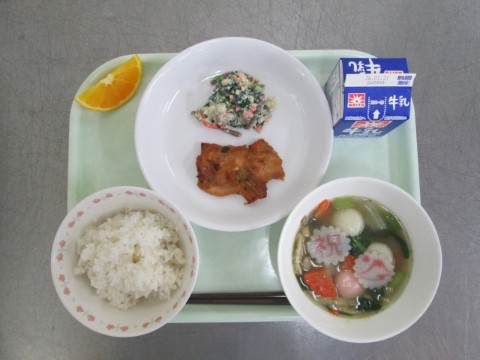 牛乳 麦ご飯 鶏肉の西京焼き風 ほうれん草の白和え 雑煮 オレンジ
