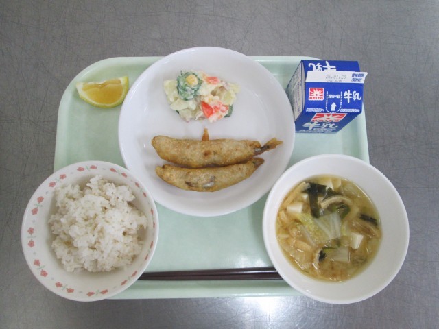 牛乳 麦ご飯 ししゃものごまフリッター ポテトサラダ わかめと白菜のみそ汁 はるか
