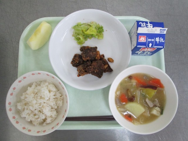 牛乳 麦ご飯 レバーの甘辛揚げ うま塩キャベツ なめこ入り豚汁 りんご