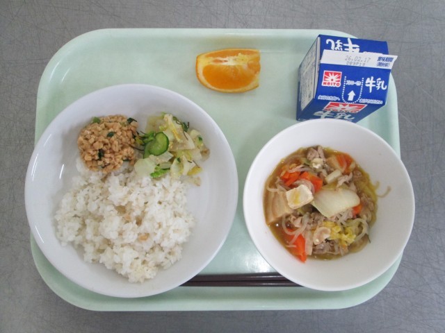 牛乳 麦ご飯 にら納豆 白菜と大根のゆず香漬け すき焼き風煮 いよかん