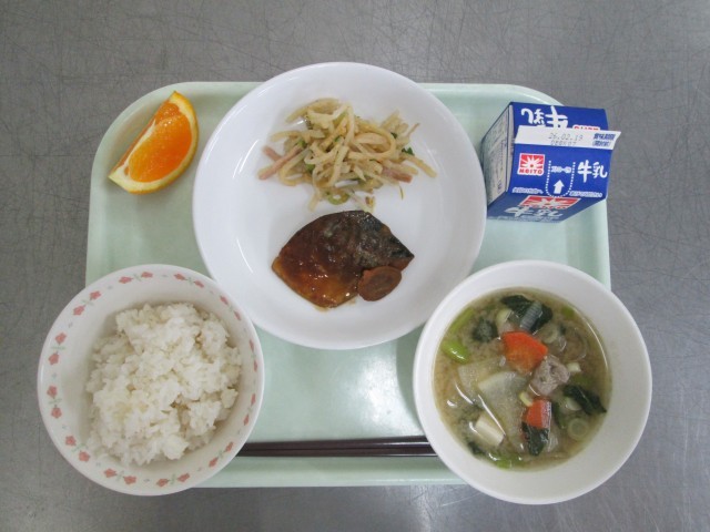 牛乳 麦ご飯 鯖のみそ煮 じゃが芋のさっぱり和え さつま汁 清見オレンジ