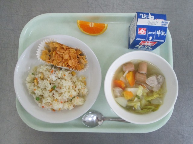 牛乳 三色ピラフ たらのパリパリ焼き ポトフ風スープ オレンジ