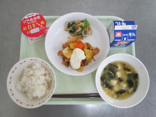 牛乳 麦ご飯 チーズタッカルビ 小松菜のナムル わかめと豆腐のみそ汁 ヨーグルト