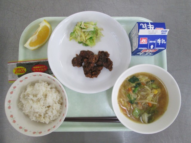 牛乳 麦ご飯 韓国風味付け海苔 レバーの甘辛揚げ うま塩キャベツ みそスープ 河内晩柑