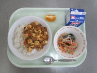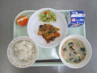牛乳 麦ご飯 鯖の豆板醬焼き じゃが芋の和風サラダ 白菜の味噌汁 柿
