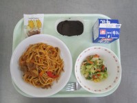 牛乳 スパゲティナポリタン ごまドレサラダ アーモンド もちもちチョコケーキ