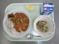 牛乳 米粉ルウのカレーライス 福神漬け ごぼうサラダ りんご