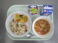 牛乳 三色ピラフ グリーンロケッツオムレツ ミネストローネ ヨーグルト