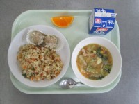 牛乳 焼き豚チャーハン ジャンボシュウマイ みそスープ オレンジ