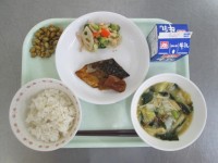 牛乳 麦ご飯 鯖のみそ煮 れんこんのごまドレサラダ 白菜の味噌汁 カリカリ大豆