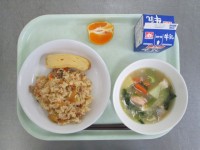 牛乳 麦ご飯 鱈のごま醤油蒸し 南瓜のサラダ 根菜汁 みかん
