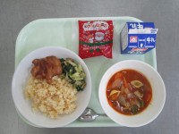 牛乳 キャロットライス ローストチキン ほうれん草としめじのソテー トマトシチュ...