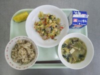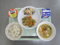 牛乳 麦ご飯 豚肉と野菜の甘辛炒め かにかまとわかめのごまマヨサラダ いろどりみ...