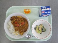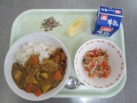 牛乳 米粉ルウのカレーライス 福神漬 こんにゃくサラダ 煮干し りんご
