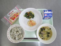 牛乳 わかめご飯 木の葉かまぼこのあられ揚げ ほうれん草のごま和え キャベツとし...