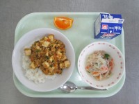 牛乳 麦ご飯 鯖の豆板醤焼き 菜の花のごまマヨネーズあえ のっぺい汁 いよかん