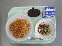 牛乳 ツナとトマトのスパゲティ 豆腐とひじきのサラダ 米粉のガトーショコラ