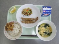 牛乳 麦ご飯 まめ豆みそ豆 ししゃものごま焼き 塩昆布和え かきたまみそ汁 はる...