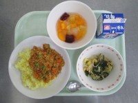 牛乳 ターメリックライス キーマカレー 海藻サラダ フルーツポンチ