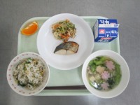 牛乳 菜の花ご飯 鰆の西京焼き 塩昆布和え 花かまぼこのすまし汁 不知火