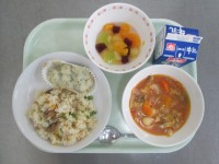 牛乳 三色ピラフ たらのポテトマヨネーズ焼き ミネストローネ フルーツのゼリーよ...