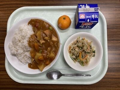 【献立】牛乳 チキンカレーライス ごまドレサラダ 冷凍みかん