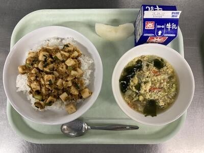 【ひとこと】 今日は、マーボー豆腐です。たんぱく質が多く、体をつくるもとになる豆腐は、カルシウムもたっぷり入っています。野菜や果物を食べると、体の防ぎょ力が上がります。ちなみに、わかめも栄養満点です。骨や歯をつくるカルシウムやマグネシウム、血液をつくるもとになる鉄や、お腹の中を掃除する食物繊維をとることができます。なんでも食べて、丈夫な体をつくりましょう。デザートの梨は、千葉県白井市産です。