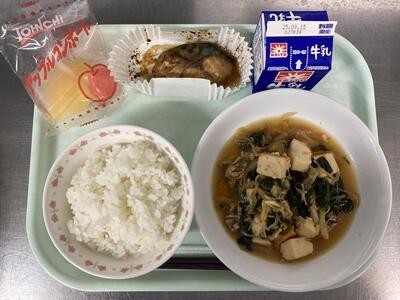 【献立】牛乳 ご飯 さばのソース焼き 肉豆腐 冷凍アップルコンポート