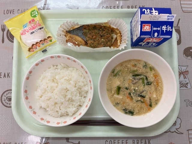 【献立】牛乳 ご飯 シイラのねぎと大豆のせ焼き かきたまみそ汁 ムース大福
