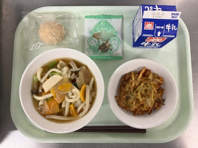【献立】牛乳 おかめうどん かみかみかき揚げ お魚アーモンド きな粉おはぎ