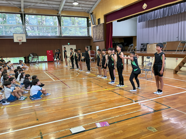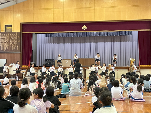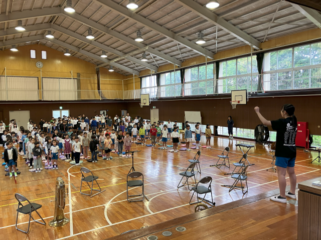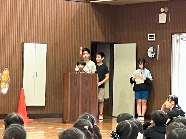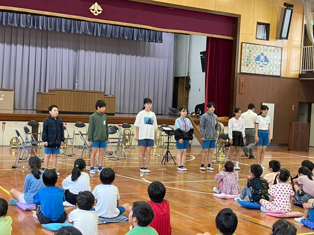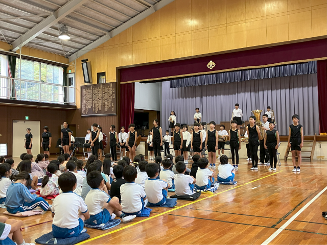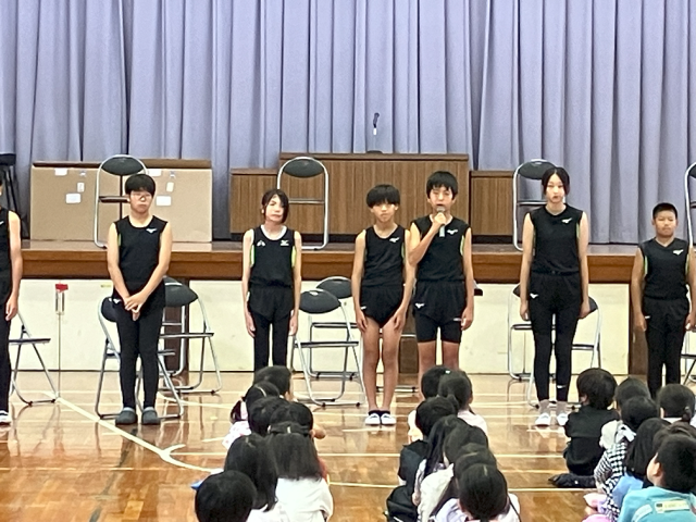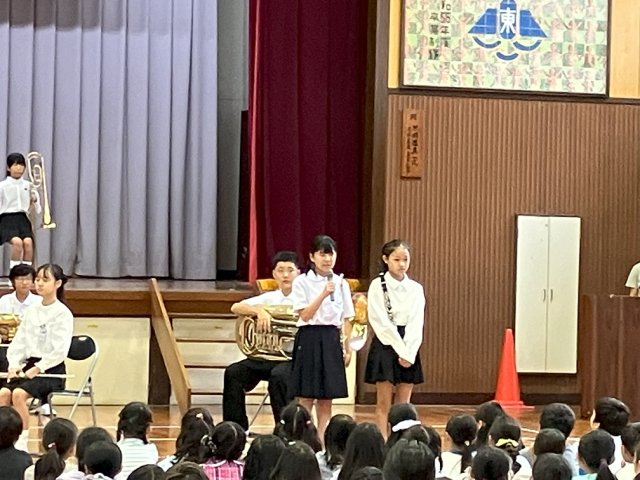 全校朝礼に引き続き、市内音楽発表会に出演する吹奏楽部と市内陸上大会に出場する陸上部の選手を励ます壮行会を行いました。司会は、児童会役員が務めてくれました。吹奏楽部は本番で演奏する曲を披露し、陸上部の選手はそれぞれの目標を発表しました。吹奏楽部、陸上部の選手のみなさん、練習の成果を発揮し頑張ってください!