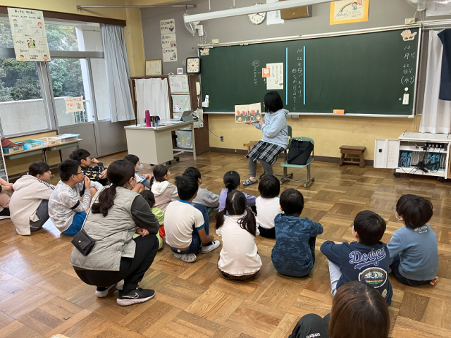 今日は、朝に読み聞かせ隊による読み聞かせがありました。少しの時間ですが、みんなで本の世界に入れる素敵な時間です。