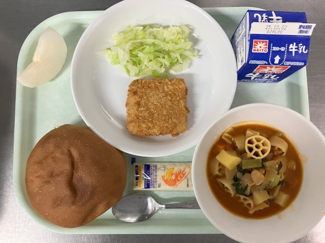 【献立】牛乳 丸パン タルタルソース フィッシュフライ ボイルキャベツ ミネストローネ 梨