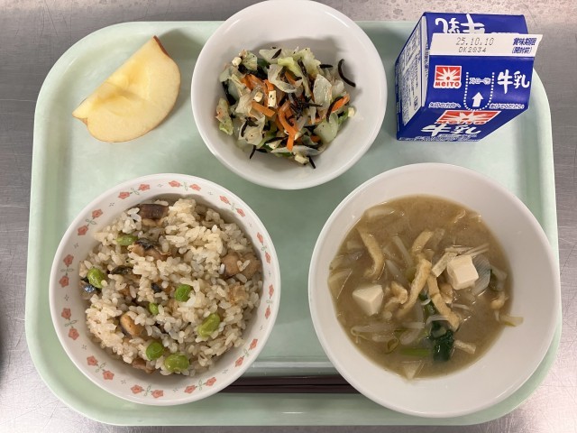 【献立】牛乳 秋刀魚ご飯 ひじきのチーズサラダ 大根と油揚げのみそ汁 りんご