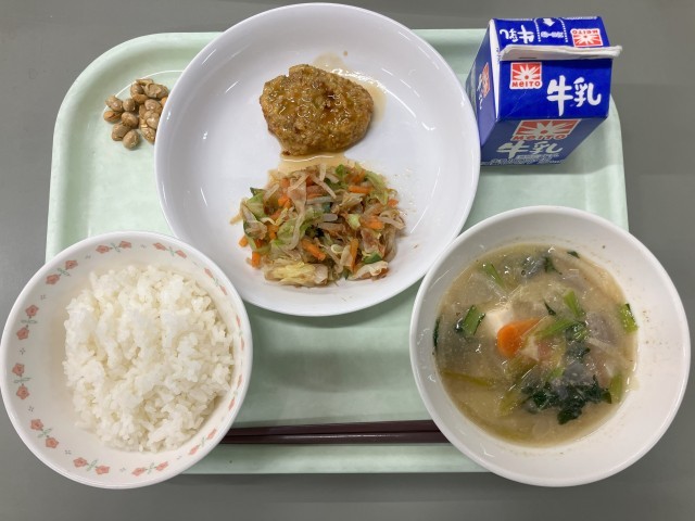 【献立】牛乳 ご飯 鶏肉とれんこんのつくね キャベツの梅おかか和え お講汁 黒糖ビーンズ