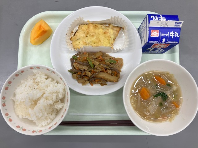 【献立】牛乳 ご飯 ほっけのポテトチーズ焼き 五目きんぴら 玉葱ともやしのみそ汁 柿
