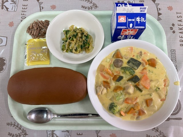 【献立】牛乳 黒糖コッペパン あんずジャム パンプキンシチュー にんじんドレッシングサラダ ココアアーモンド