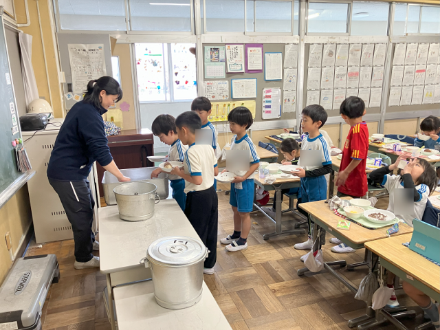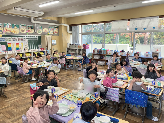 今日から、業間休みの持久走練習がスタートしました!学団ごとに3つのコースに分かれて、それぞれのペースで頑張っていました。今日の給食は、人気のココアあげパンでした。みんな美味しそうに食べていました。