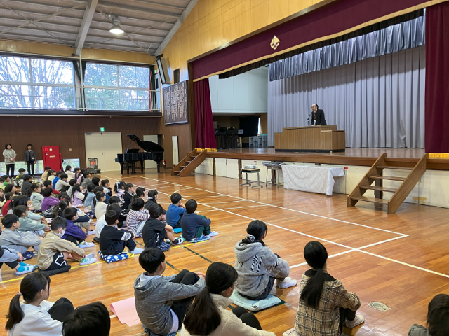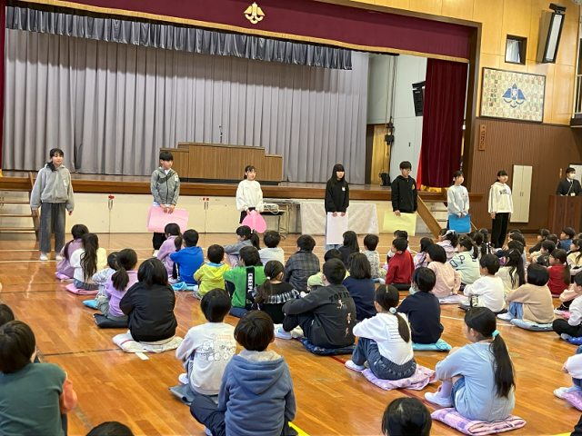 今日は、12月の全校朝礼を行いました。校長先生からは、「わらしべ長者」の話や「情けは人の為ならず」のことわざを例に、困っている友達がいたら親切にしましょうという話がありました。その他、保健委員会、給食委員会、心の相談室の素晴らしい発表がありました。