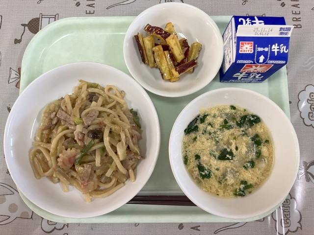 【献立】牛乳 五目焼きうどん 大根とたまごの中華スープ さつまスティック