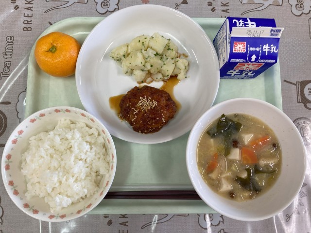 【献立】牛乳 ご飯 おからハンバーグ じゃがバター なめこと豆腐のみそ汁 みかん