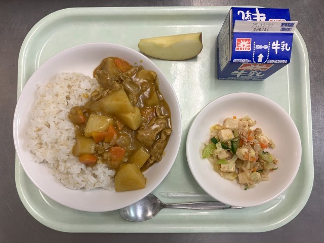 【献立】牛乳 ポークカレーライス 豆腐とツナの和風サラダ りんご