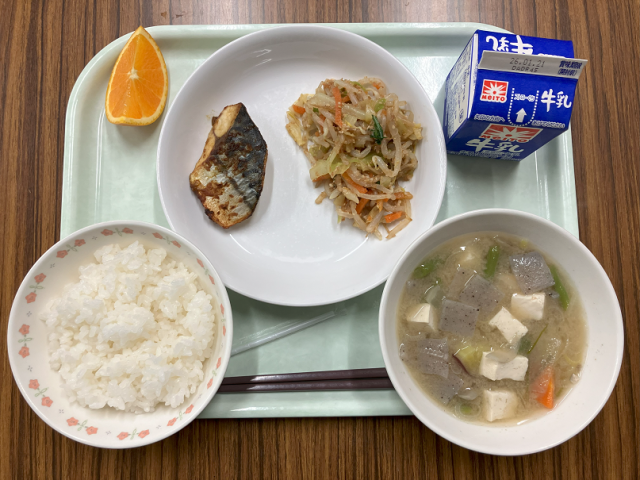 【献立】牛乳 ご飯 さばのカレー焼き ハム入りお浸し さつま汁 オレンジ